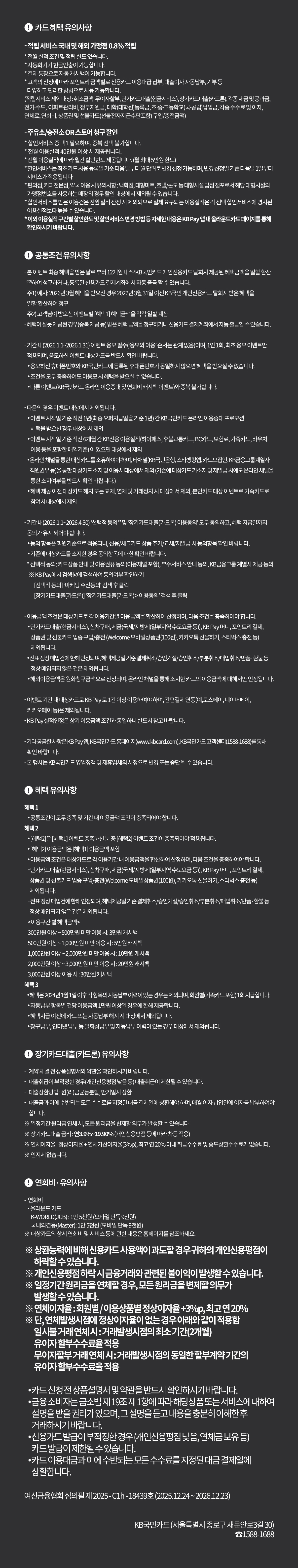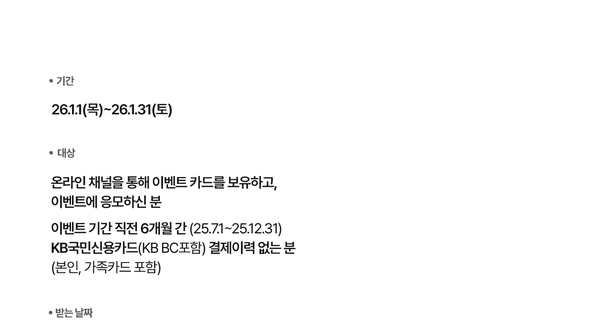 - 이벤트 기간 직전 6개월 간 (25.7.1~25.12.31) KB국민신용카드(KB BC포함) 결제이력 없는 분(본인, 가족카드 포함)
