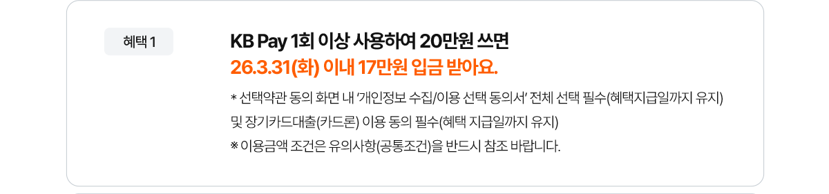 - 혜택 1. KB Pay 1회 이상 사용하여 20만원 쓰면 26.3.31(화) 이내 17만원 입금 받아요.