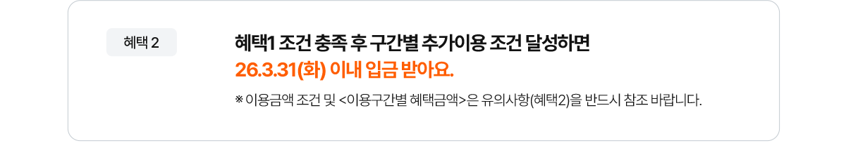- 혜택 2. 혜택1 조건 충족 후 구간별 추가이용 조건 달성하면 26.3.31(화) 이내 입금 받아요.