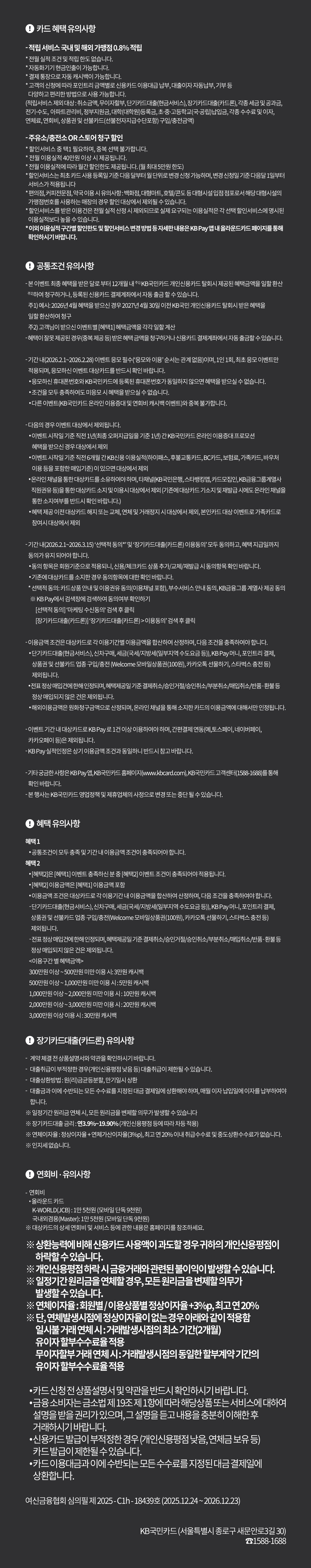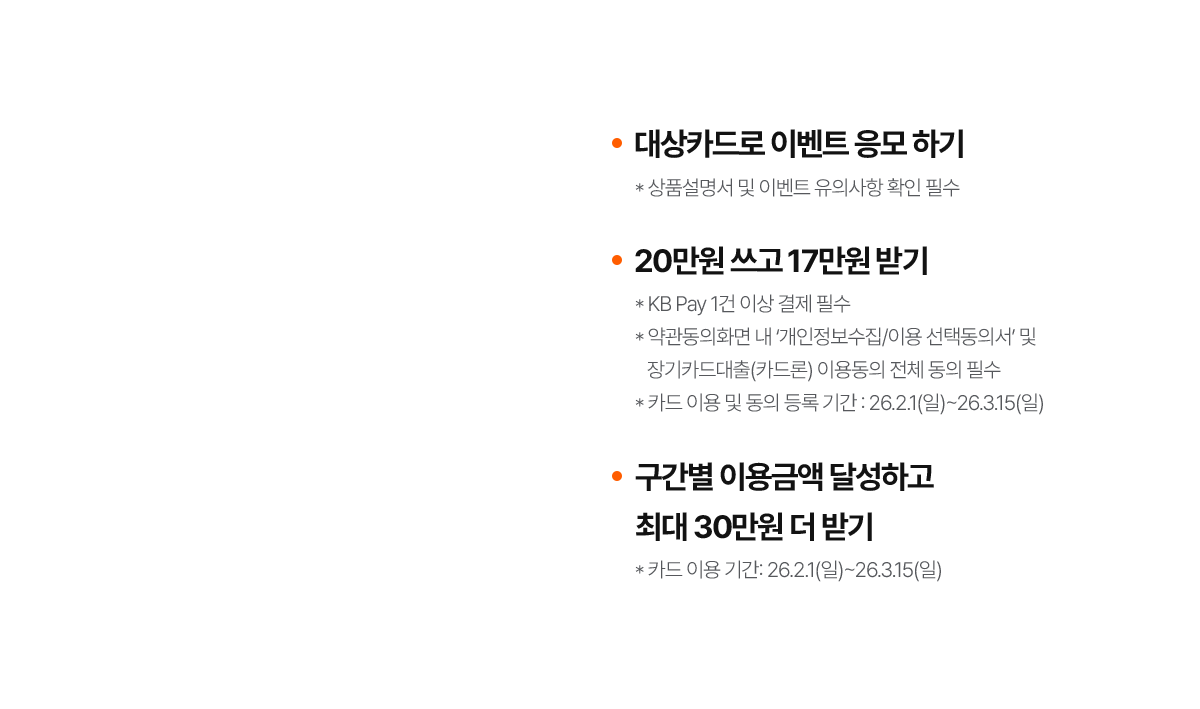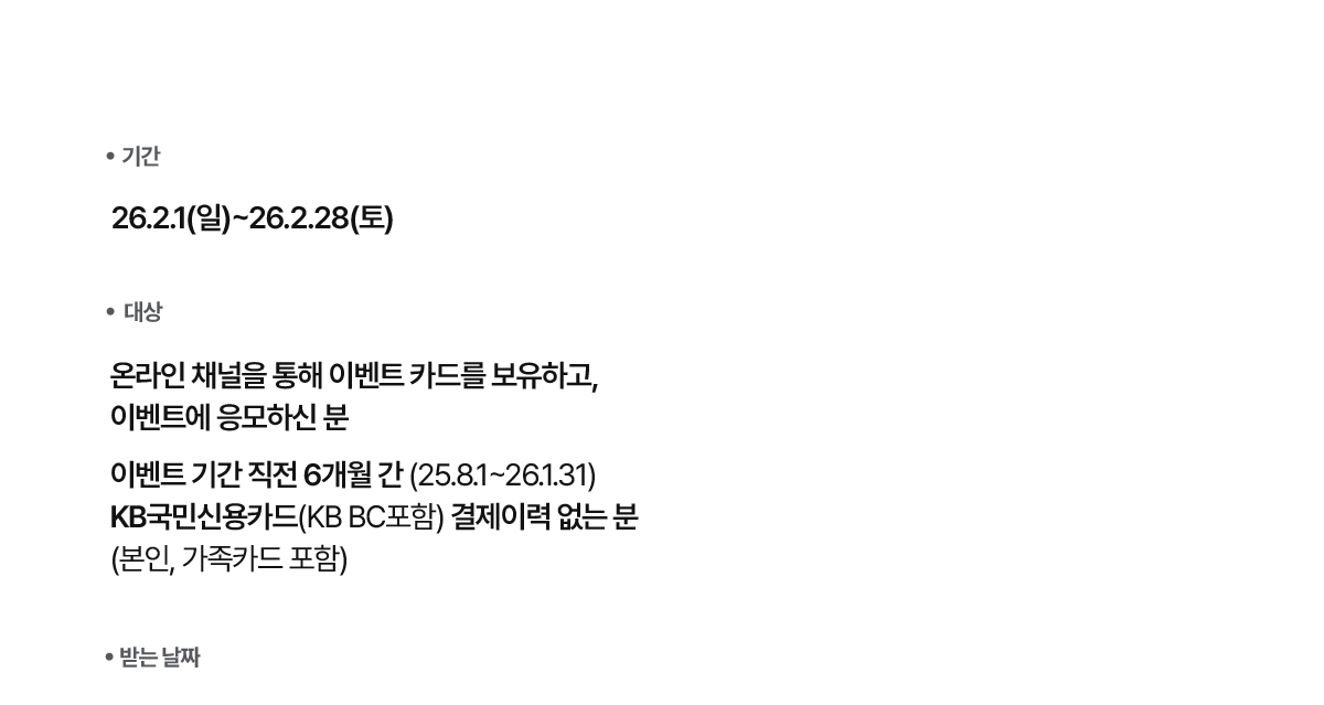 - 이벤트 기간 직전 6개월 간 (25.8.1~26.1.31) KB국민신용카드(KB BC포함) 결제이력 없는 분(본인, 가족카드 포함)
