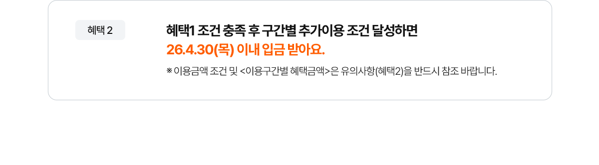 - 혜택 2. 혜택1 조건 충족 후 구간별 추가이용 조건 달성하면 26.4.30(목) 이내 입금 받아요.