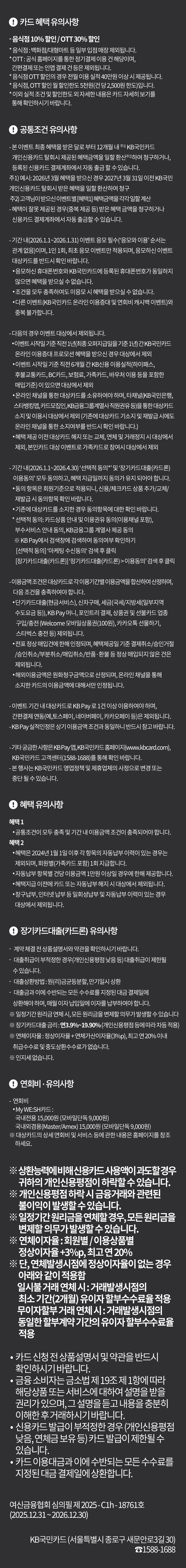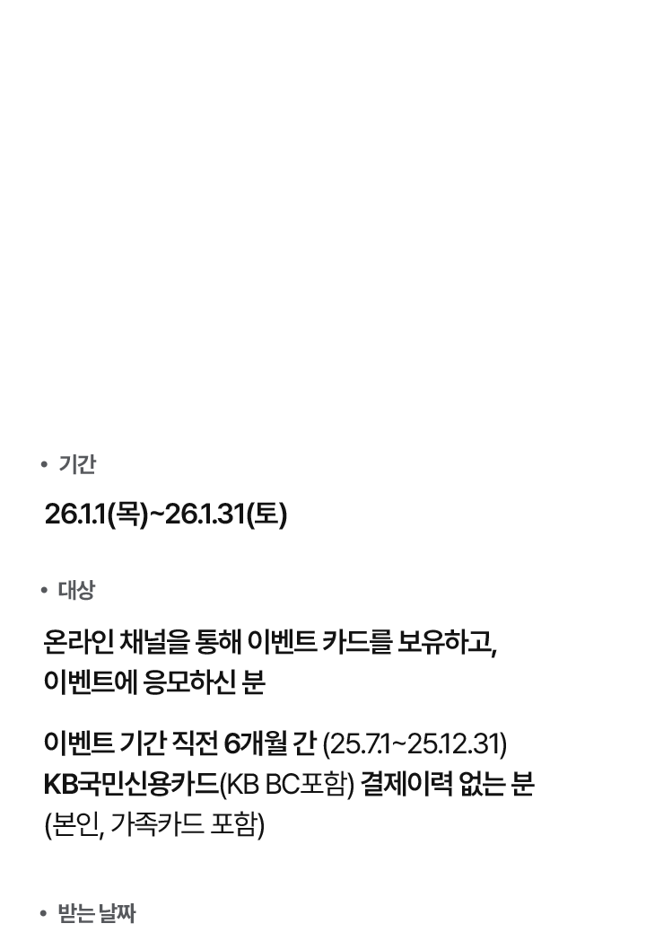 - 이벤트 기간 직전 6개월 간 (25.7.1~25.12.31) KB국민신용카드(KB BC포함) 결제이력 없는 분(본인, 가족카드 포함)