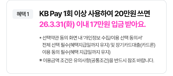 - 혜택 1. KB Pay 1회 이상 사용하여 20만원 쓰면 26.3.31(화) 이내 17만원 입금 받아요.
