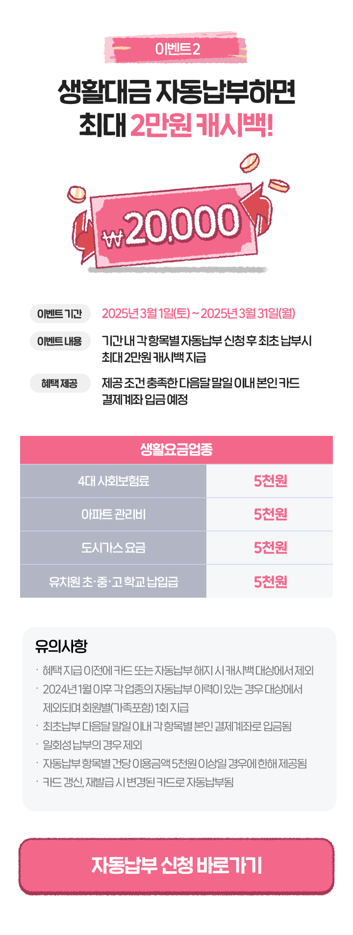 - 2025년 3월 1일(토) ~ 2025년 4월 15일(화)동안 9만원 이상 이용 시 9만원 캐시백