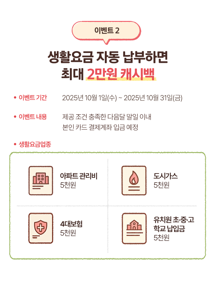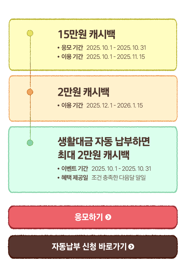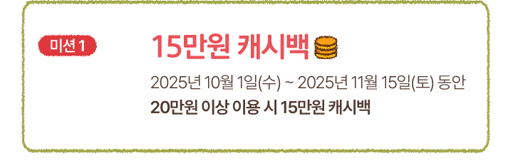 - 2025년 10월 1일(수) ~ 2025년 11월 15일(토) 동안 20만원 이상 이용 시 15만원 캐시백