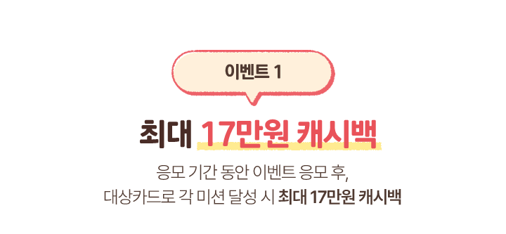 응모 기간 동안 이벤트 응모 후, 대상카드로 각 미션 달성 시 최대 17만원 캐시백!