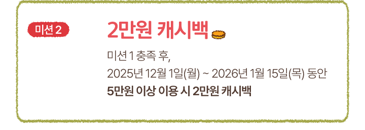 - 미션 1 충족 후, 2025년 12월 1일(월) ~ 2026년 1월 15일(목) 동안 5만원 이상 이용 시 2만원 캐시백
